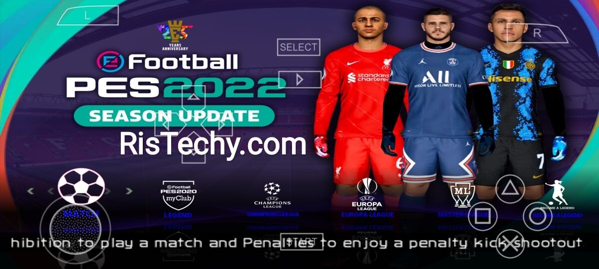 Popular Leagues such as Premier League, La Liga, Europa League, Champions League, Master League, Legend players, Africa Nations Cup, World Cup etc. Can also be found in the new Edition of PES 2022 PSP Iso Save Data and Texture files.